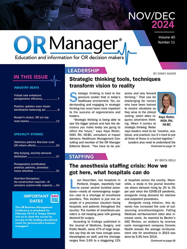 How should responsibilities associated with C-sections be divided between the OR team and the OB/GYN department at a staff-strapped rural hospital? This was just one of many questions I had never considered prior to attending the 2024 OR Manager Conference, which drew perioperative professionals to the MGM Grand in Las…